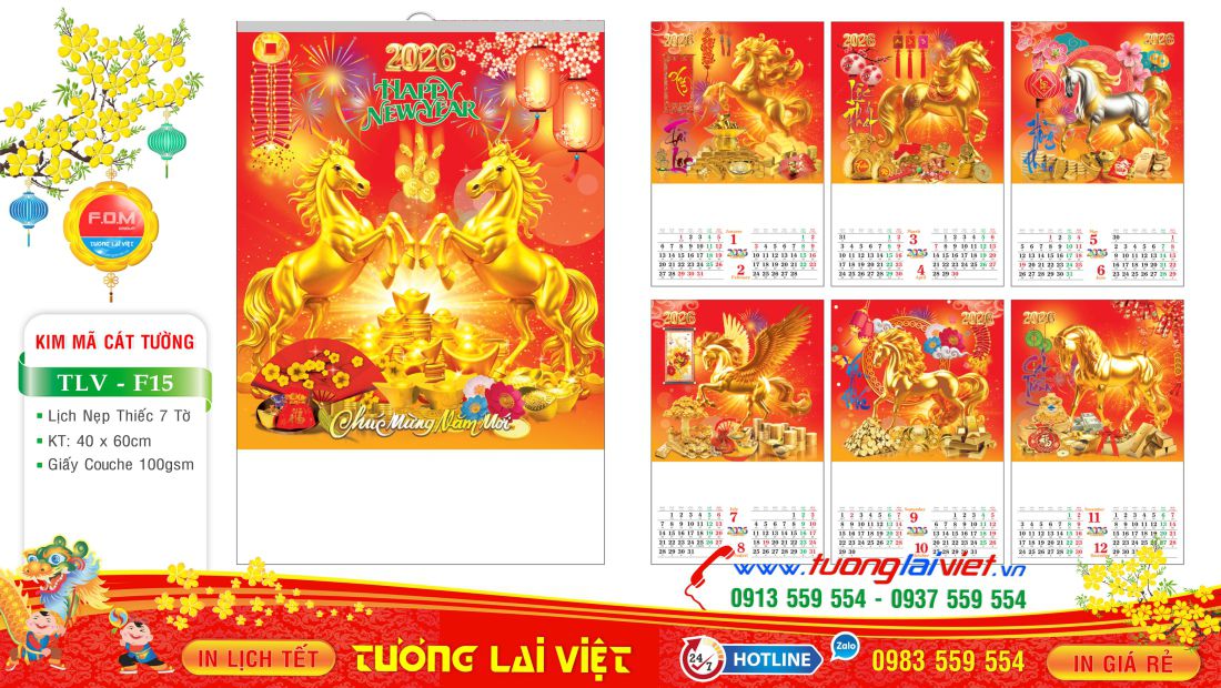 Lịch 7 tờ nẹp thiếc thường được in Offset 1 mặt trên giấy C105gsm, có kích thước: 36×70 và 45x70cm. Lịch 7 tờ Mã Đáo Thành Công là mẫu lịch tờ treo tường giá rẻ nên được nhiều cửa hàng nhỏ lẻ chọn in lịch tết năm nay để làm quà tặng cuối năm cho khách hàng, bạn bè, đối tác và người thân nhân dịp năm mới.