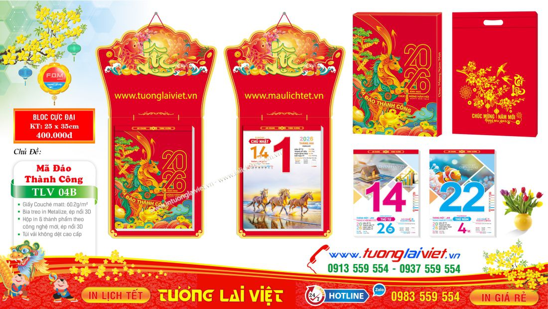 Ngoài Lịch bloc khổ cực đại (25×35), In TLV còn sản xuất và phân phối những Mẫu lịch tết treo tường gắn với các Mẫu Lịch bloc Khổ đại như: Lịch bloc siêu cực đại (30×40) khổ A3, Lịch bloc siêu đại (20×30) Khổ A4, Lịch bloc Khổ đại (17×24), Lịch bloc đại (15×20) khổ A5 gắn với Bìa lịch treo tường và Lịch bloc khổ lớn nhất hiện nay kích thước (38×54). Bên cạnh đó, còn có Mẫu Lịch bloc Bìa Laminate, Lịch gỗ Laminate và Lịch gỗ Phù Điêu cao cấp.